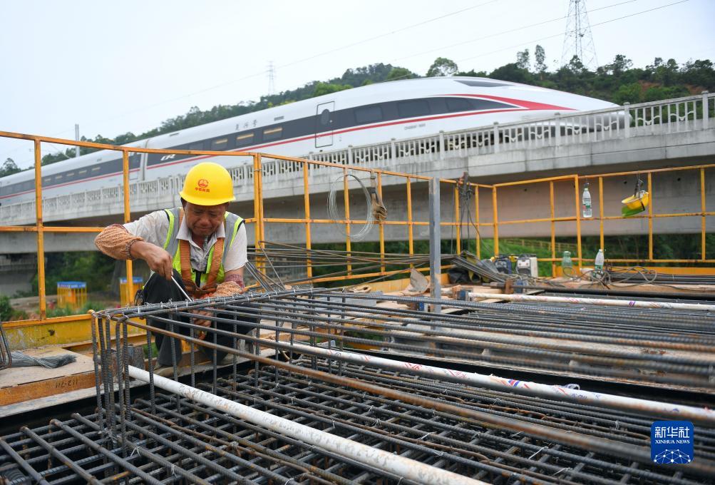 9月6日,中鐵四局施工人員在深江鐵路深圳段高峰水庫大橋上進行主墩施工。