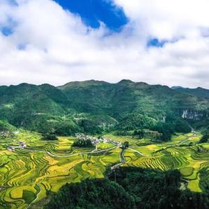 白露將至,貴州省黔南布依族苗族自治州貴定縣沿山鎮臘利梯田裏的水稻逐漸成熟,呈現出一幅豐收在望的秋日畫卷。