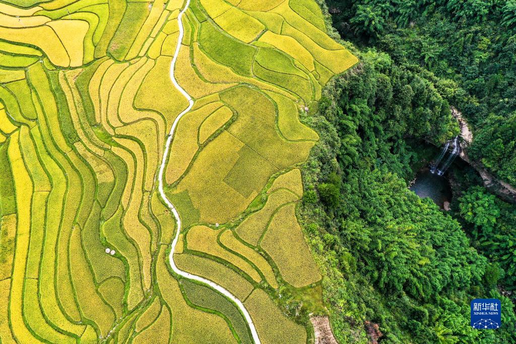 白露將至,貴州省黔南布依族苗族自治州貴定縣沿山鎮臘利梯田裏的水稻逐漸成熟,呈現出一幅豐收在望的秋日畫卷。