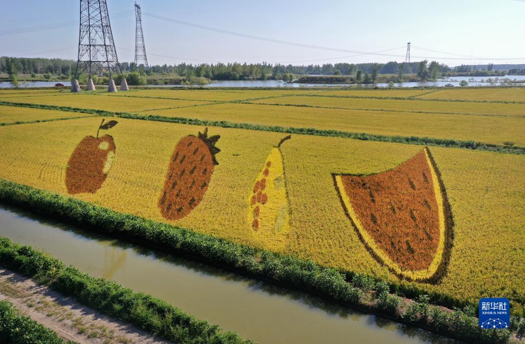 初秋時節,遼寧省鞍山市&安縣遼河文化旅游景區的稻田畫吸引不少游客前來參觀游覽。由多種顏色組成的巨型稻田畫勾勒出豐收壯美景象。