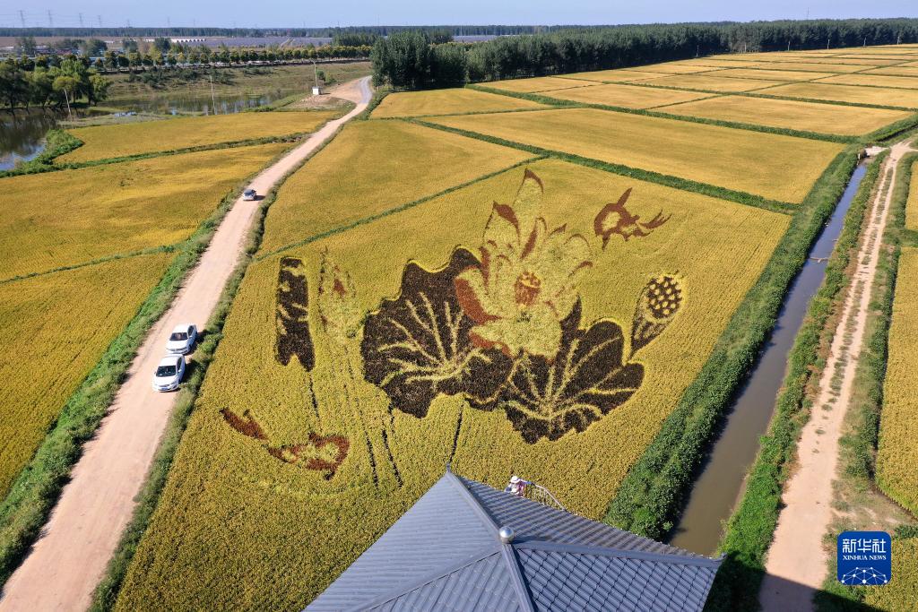 初秋時節,遼寧省鞍山市&安縣遼河文化旅游景區的稻田畫吸引不少游客前來參觀游覽。由多種顏色組成的巨型稻田畫勾勒出豐收壯美景象。
