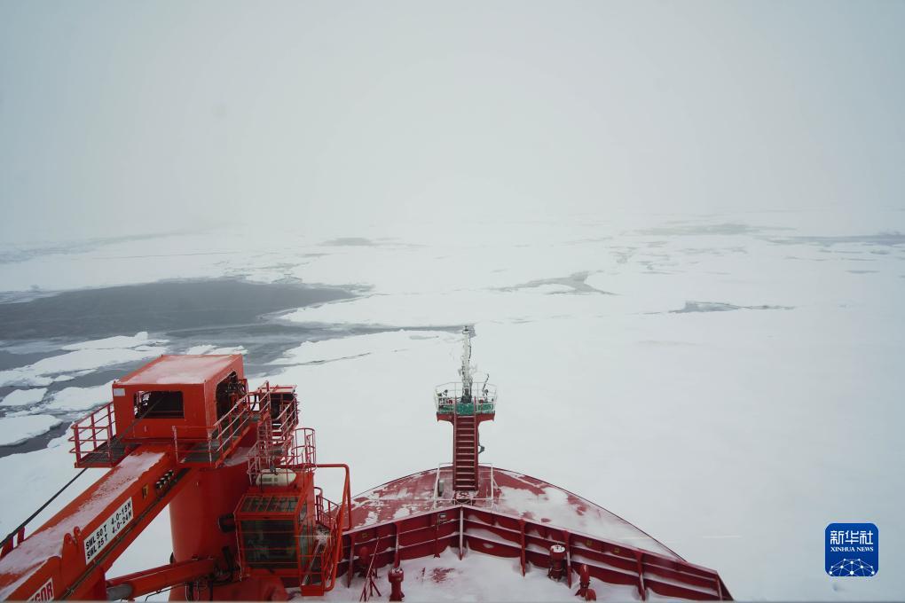這是抵達北極點瞬間,“雪龍2”號極地科考破冰船前方的浮冰(9月5日攝)。