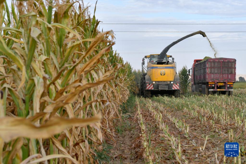 9月5日,在張掖市山丹縣位奇鎮四壩村,工作人員使用大型機械收穫青貯玉米。