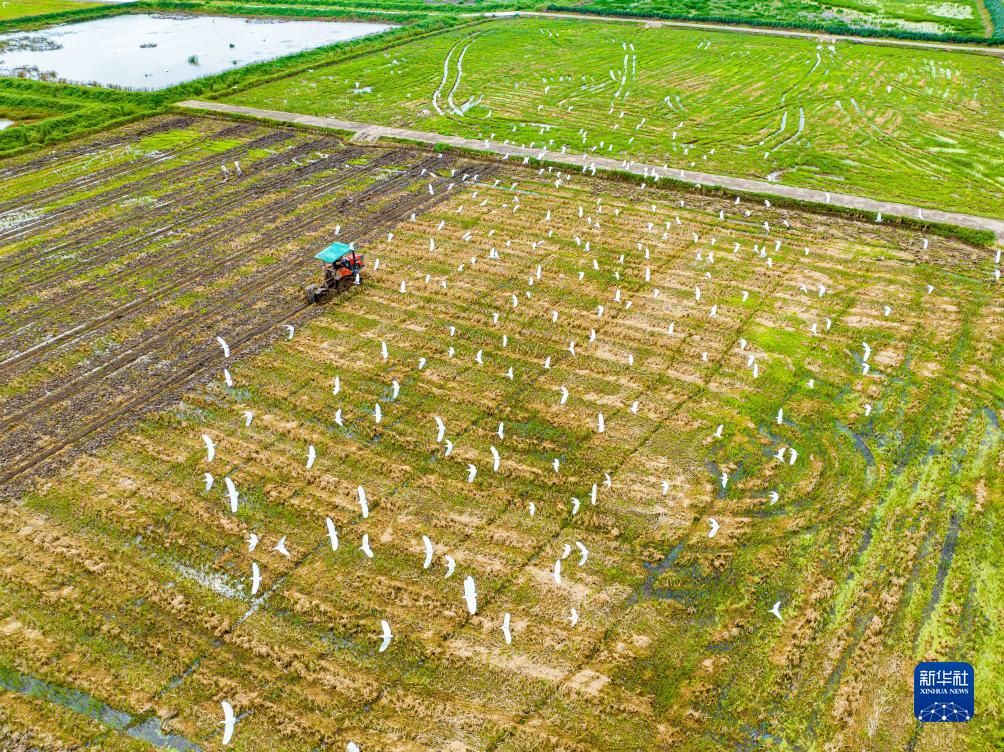 9月7日,浙江省溫嶺市石橋頭鎮土坦新村,農民駕駛農機翻耕整地,成群的白鷺跟隨農機覓食、飛舞(無人機照片)。