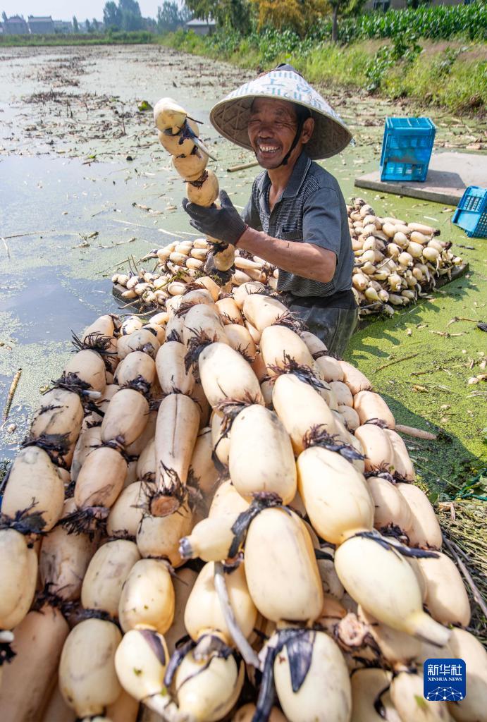 9月7日,農戶在江蘇省泰州市姜堰區顧高鎮夏莊村蓮藕種植基地分揀采收的蓮藕。