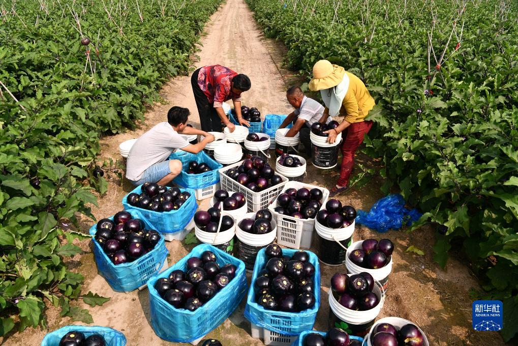 9月7日,在河北省石家莊市欒城區魯家莊村,茄農將收穫的茄子裝箱,準備運往市場銷售。