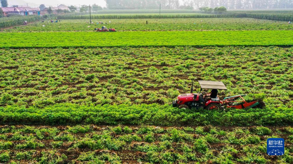 9月6日,河北省遵化市劉備寨鄉安各寨村農民駕駛農機收穫花生(無人機照片)。