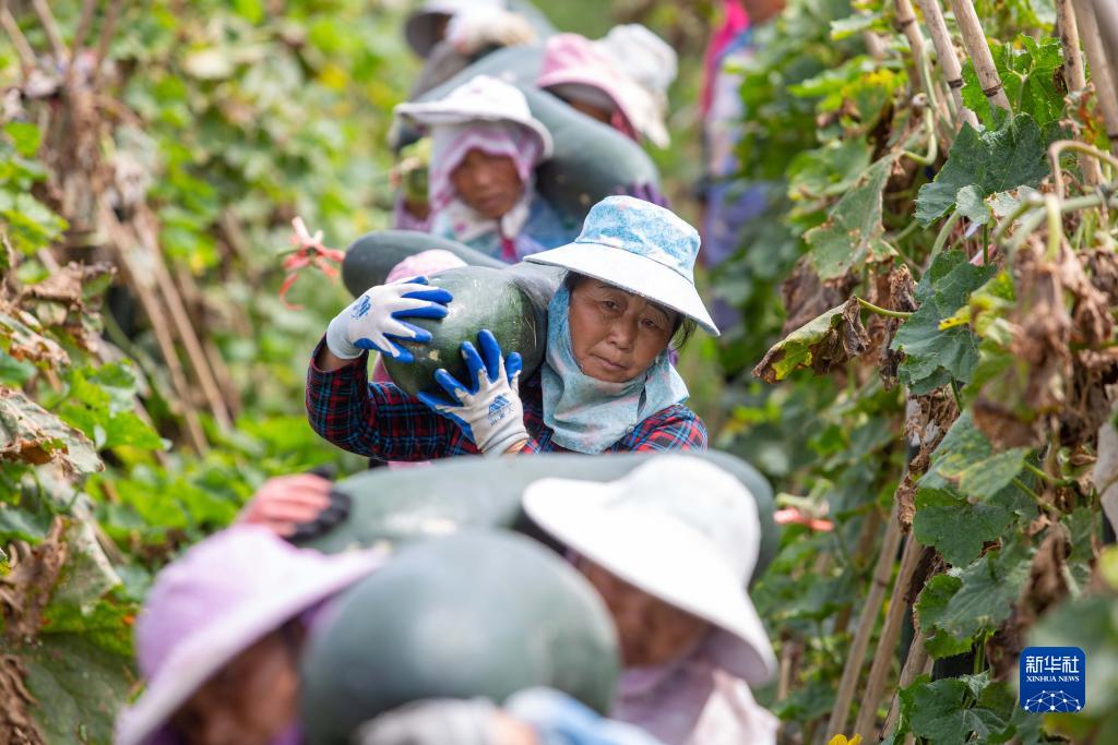 9月7日,農民在貴州省安順市西秀區舊州鎮浪塘村搬運採摘的冬瓜。