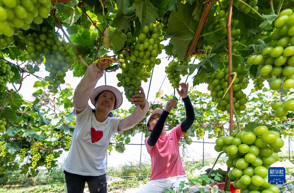 9月7日,村民在貴州省黔西市金碧鎮新蘭村葡萄種植基地採摘葡萄。