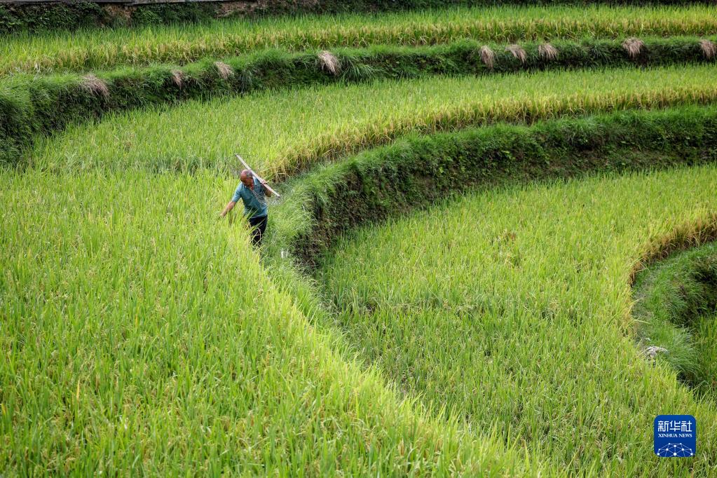 9月7日,村民在貴州省黔東南苗族侗族自治州丹寨縣排調鎮黨幹村查看水稻長勢。