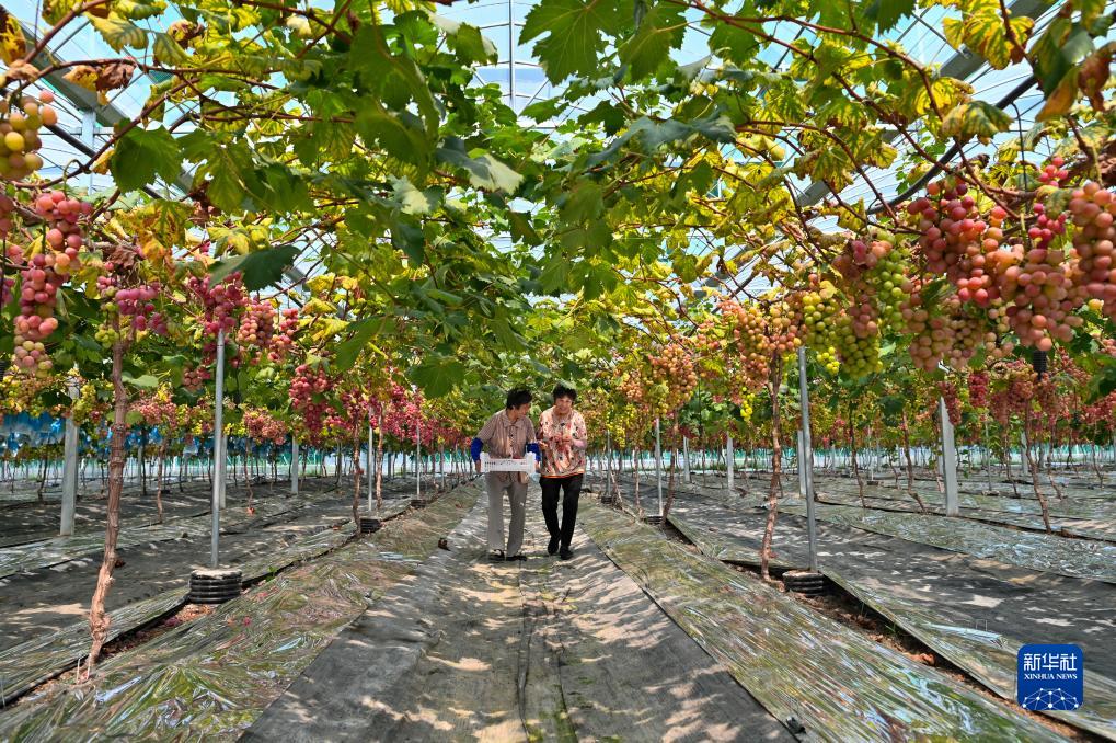 9月7日,在江蘇省鹽城市建湖縣一處葡萄園,農業工人在運輸剛採摘的葡萄。