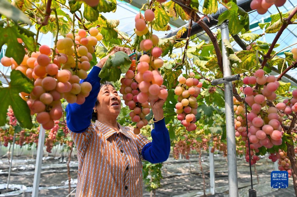 9月7日,在江蘇省鹽城市建湖縣一處葡萄園,農業工人在採摘葡萄。