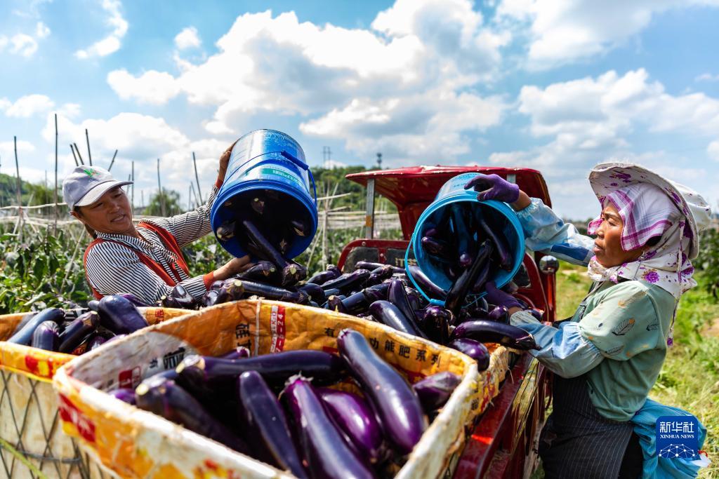 9月6日,農民在貴州省安順市西秀區舊州鎮浪塘村將採摘的茄子裝車。