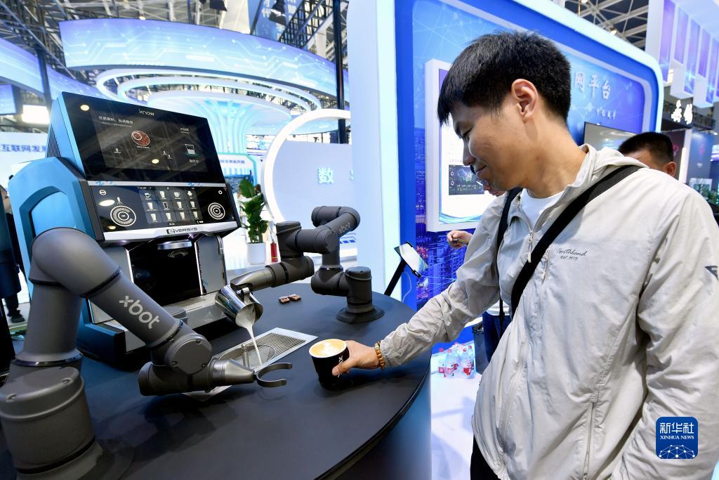 9月7日,參觀者在2023中國國際數字經濟博覽會上體驗艾博咖啡機器人。