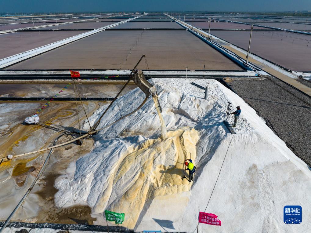 9月7日,在江蘇省鹽城市響水縣,工人在江蘇省銀寶鹽業有限公司的鹽田裏扒鹽(無人機照片)。