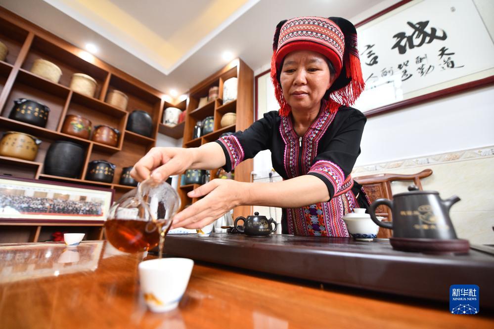 在梧州市蒼梧縣六堡鎮山坪村,六堡茶製作技藝非遺傳承人祝雪蘭在工作室裏泡茶(6月7日攝)。