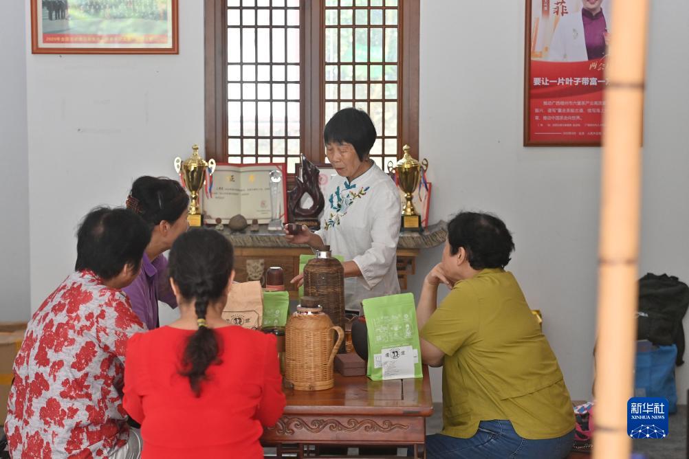 在梧州市蒼梧縣六堡鎮黑石山茶廠,六堡茶製作技藝非遺傳承人韋潔群(左二)向游客介紹茶文化(9月6日攝)。