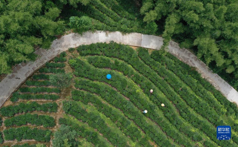 在梧州市蒼梧縣六堡鎮塘坪村,茶農在茶園裏採茶(無人機照片,9月6日攝)。