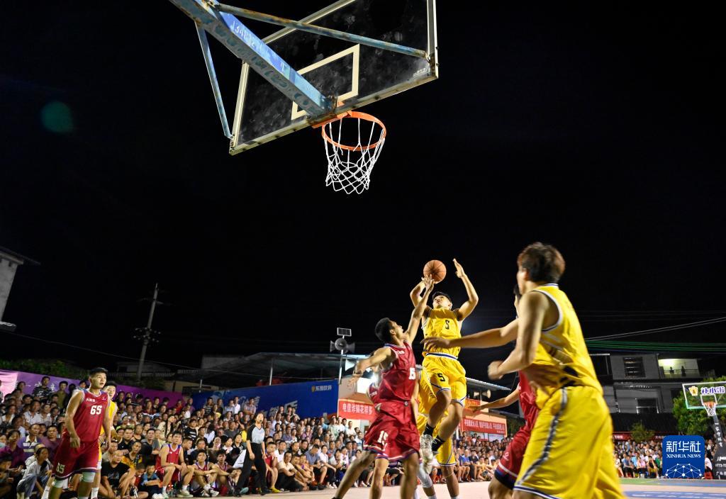 9月6日晚,在柳江區穿山鎮男子籃球賽決賽現場,球員在場上拼搶。