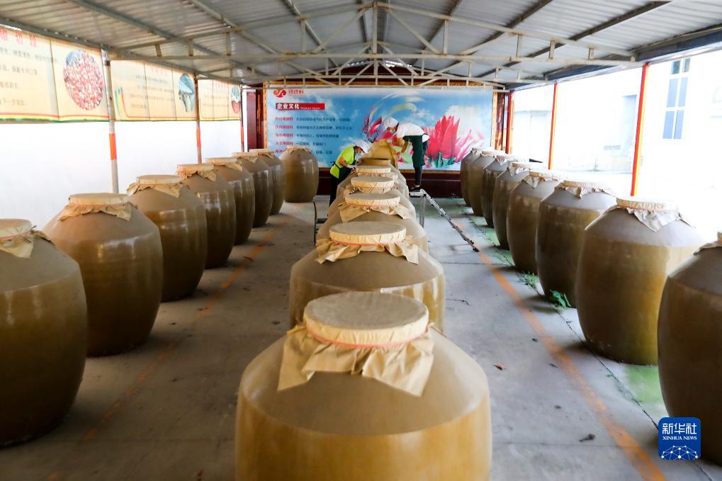 9月6日,在河南省商丘市柘城縣辣椒醬生産企業,工作人員在清理醬缸。