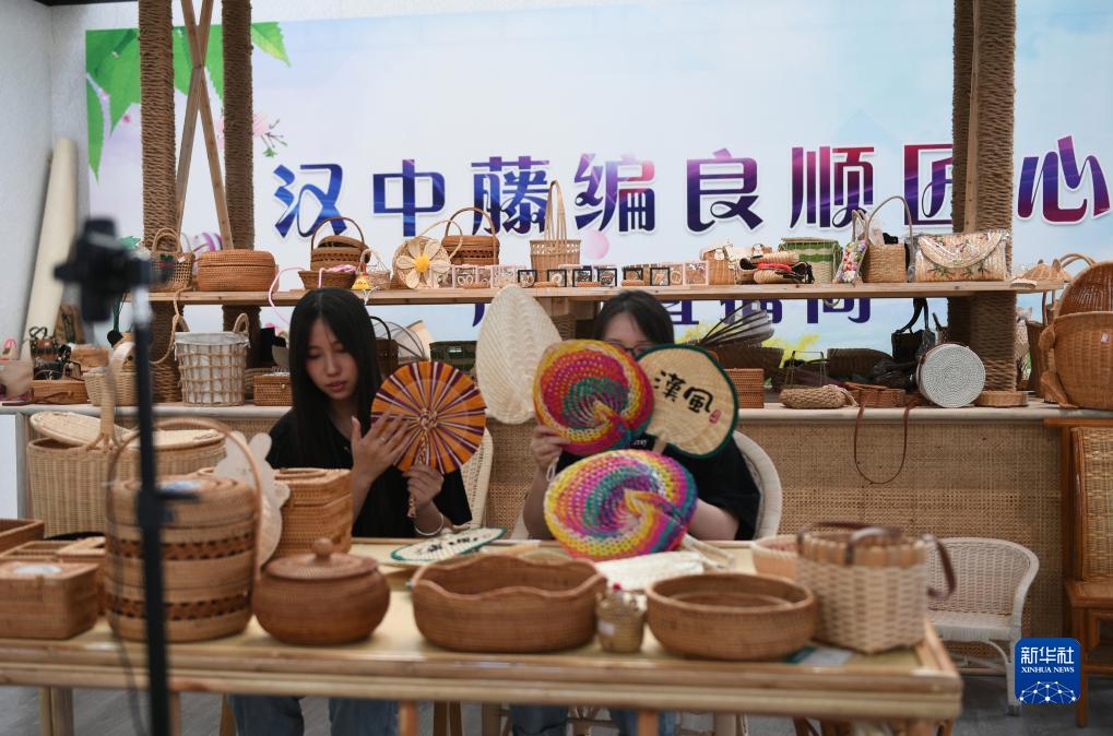 9月7日,在位於漢中市的陜西良順匠心實業有限公司,工作人員在直播推薦藤編工藝品。