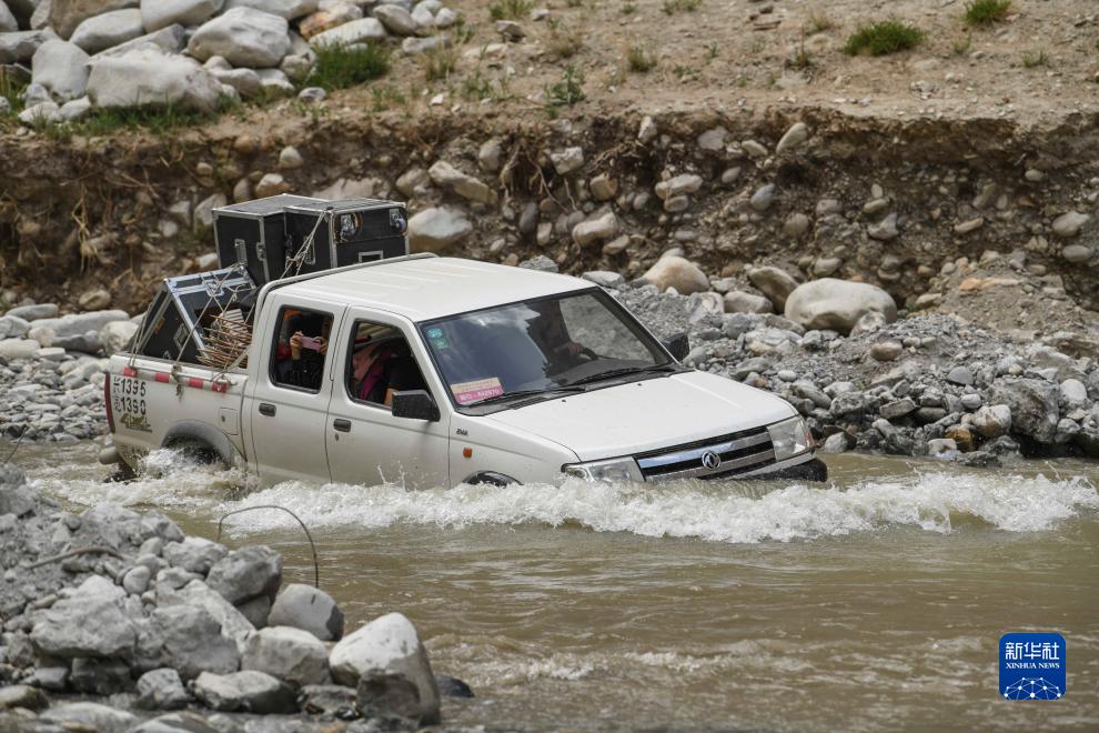 在一次下鄉進村演出途中,新疆塔縣文工團演員拜合提亞爾·居馬汗和同事駕車穿越一處涉水路段(2020年6月5日攝)。