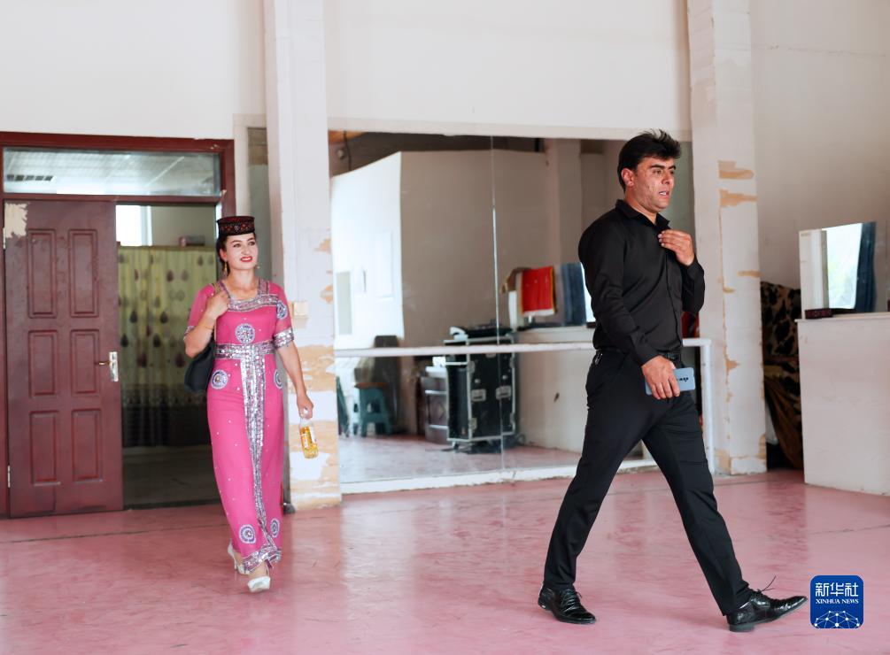 完成迎賓演出後,拜合提亞爾·居馬汗和妻子離開游客服務中心,準備前往學校接孩子回家(9月4日攝)。