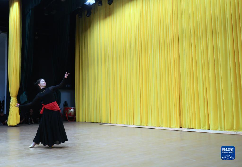 古麗巴努爾·庫爾恰克在文化服務中心劇場排練舞蹈節目《花兒為什麼這樣紅》(9月4日攝)。