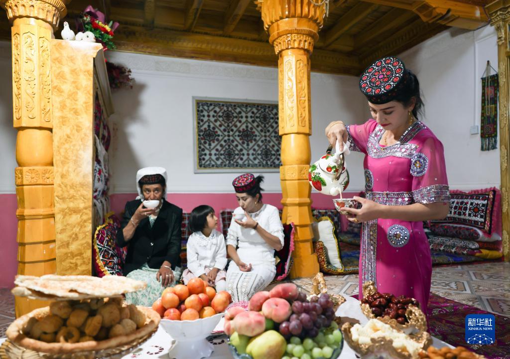 回到家中的古麗巴努爾·庫爾恰克(右)為家人們倒上奶茶(9月4日攝)。