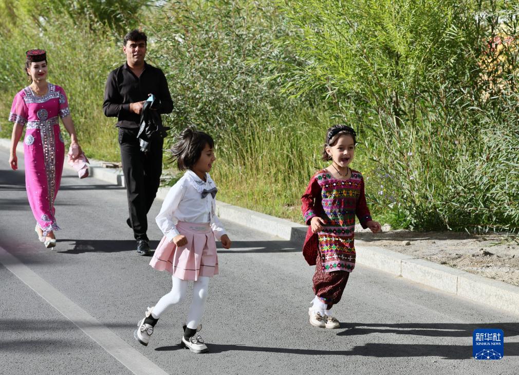 放學路上,拜合提亞爾·居馬汗和妻子走在路上,望著前方奔跑嬉鬧的女兒(前右)和侄女(9月4日攝)。