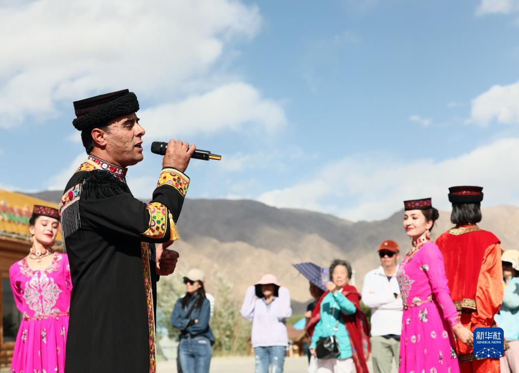 在新疆塔縣帕米爾旅游區游客服務中心,拜合提亞爾·居馬汗為游客演唱《花兒為什麼這樣紅》(9月4日攝)。