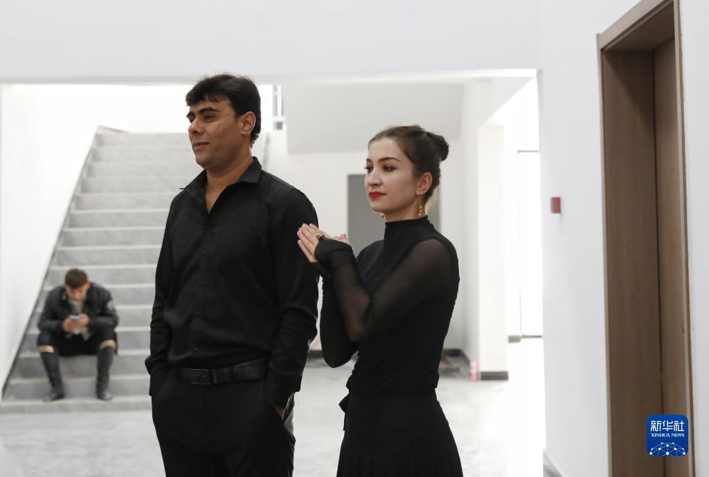 排練間歇,拜合提亞爾·居馬汗和妻子在一旁觀看同事排練(9月4日攝)。