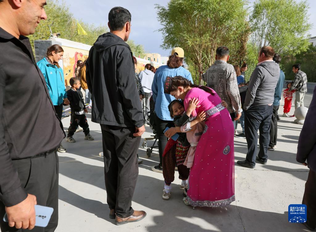從幼兒園放學的女兒迪力巴努撲向媽媽的懷抱(9月4日攝)。