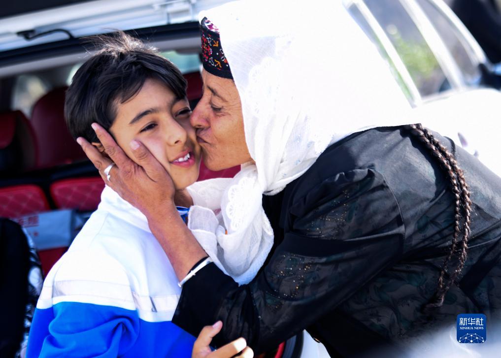 拜合提亞爾·居馬汗的母親親吻剛剛放學回家的孫子木拉夏提(9月4日攝)。