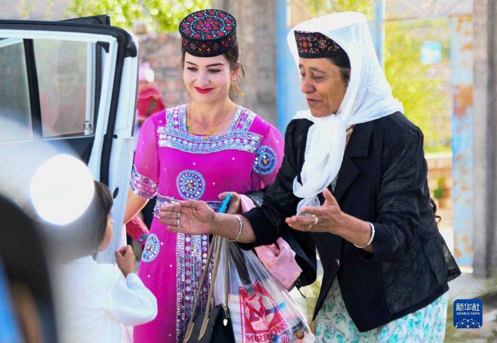 古麗巴努爾·庫爾恰克(中)帶着孩子們回家,拜合提亞爾·居馬汗的母親出門迎接孩子(9月4日攝)。