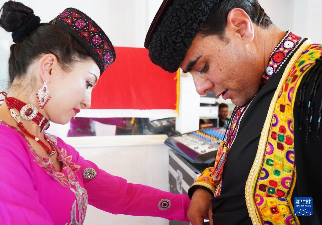 迎賓演出開始前,古麗巴努爾·庫爾恰克為丈夫整理演出服裝(9月4日攝)。