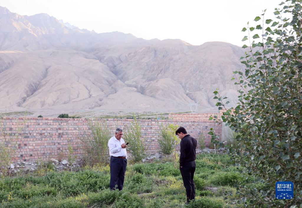 拜合提亞爾·居馬汗(右)和父親站在自家院子裏(9月4日攝)。