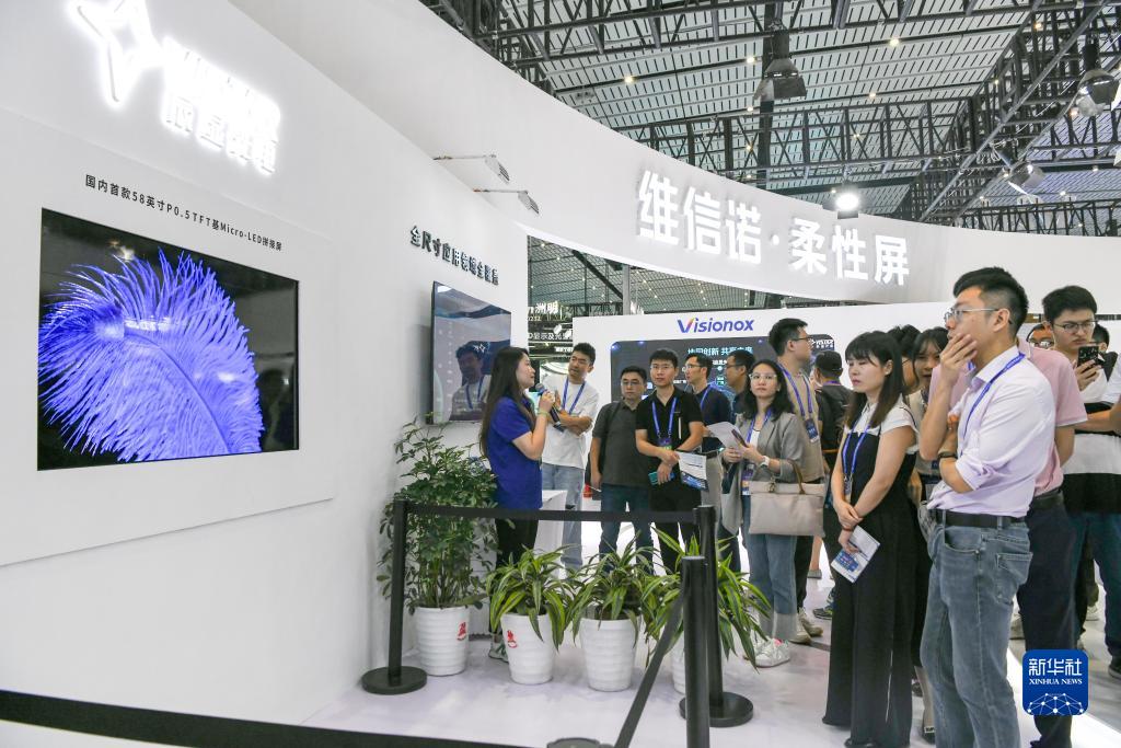 9月7日,在“2023世界顯示産業大會新型顯示創新成果展”現場,觀眾觀看國內首款58英寸P0.5 TFT基Micro-LED拼接屏。