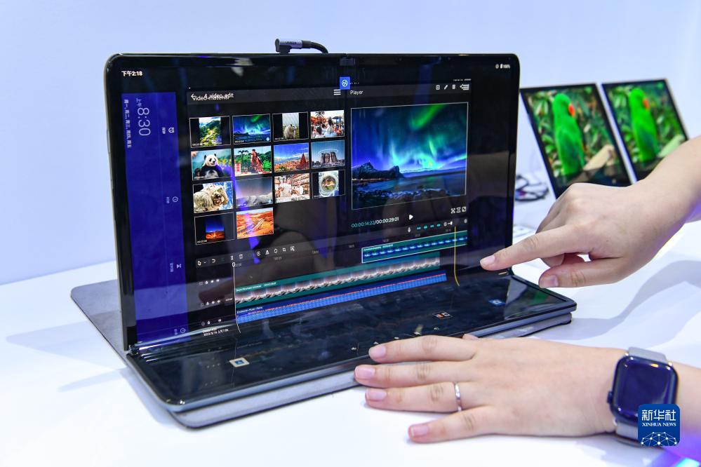 9月7日,在“2023世界顯示産業大會新型顯示創新成果展”現場,工作人員在展示京東方17.3"X-Fold十字折疊OLED。