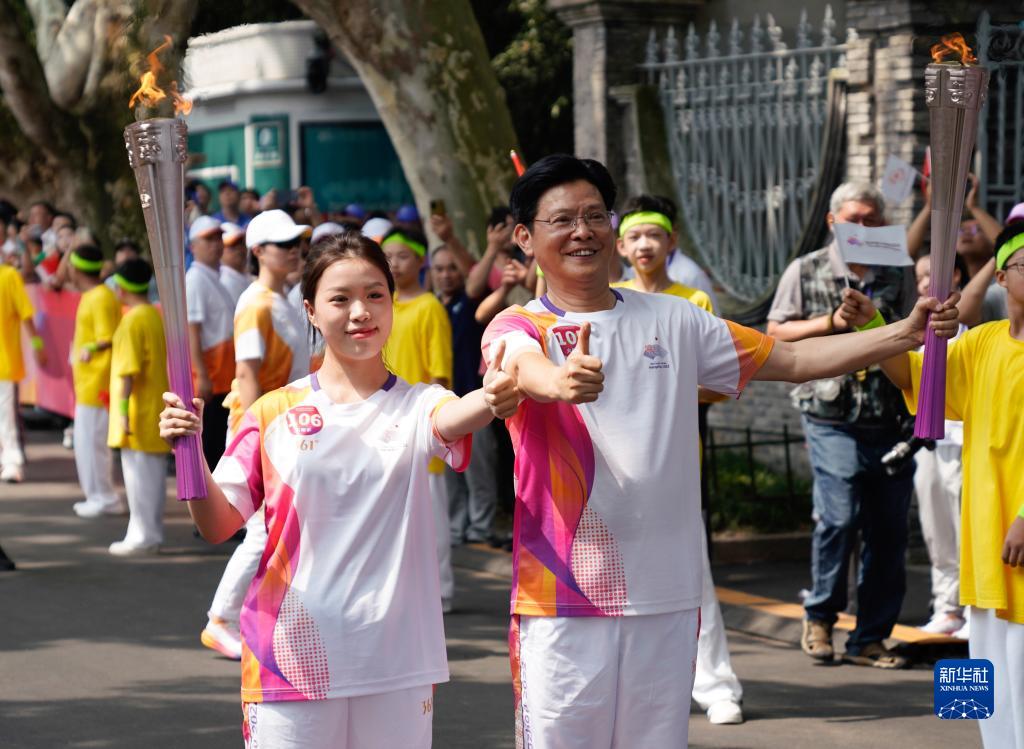 9月8日,火炬手陳立群(右)與楊倩在火炬傳遞中。