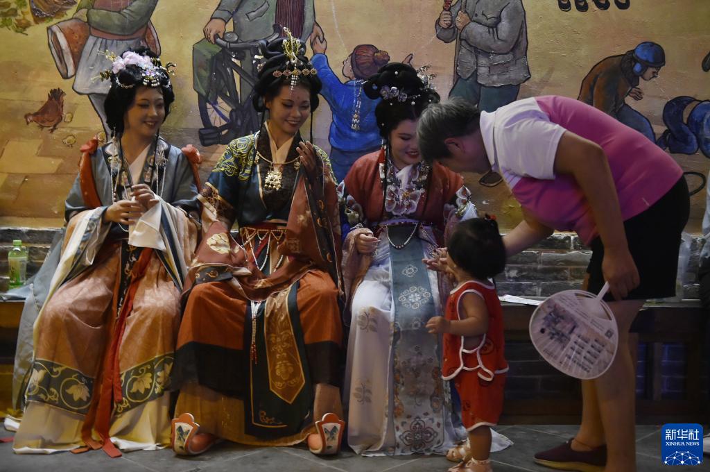 9月7日晚,身穿古裝的游人在安陽古城縣前街的夜游活動現場與小朋友互動。