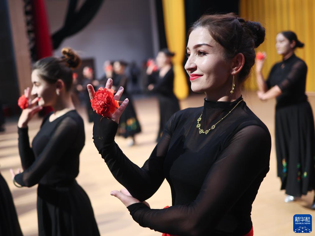 新疆塔縣文工團舞蹈演員古麗巴努爾·庫爾恰克(右)和同伴們一起排練《花兒為什麼這樣紅》(9月4日攝)。新華社記者 蘭紅光 攝