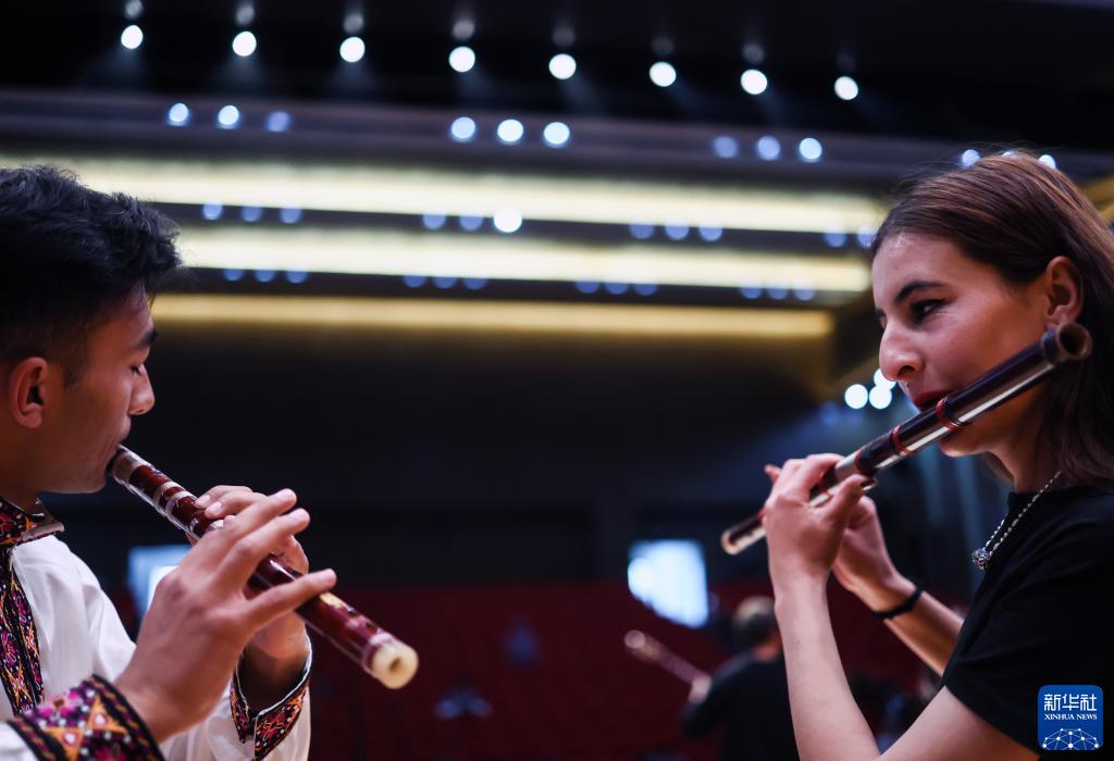 新疆塔縣文工團樂手美麗卡·依沙克(右)和同伴一起排練器樂演奏節目《絲路遺夢》(9月4日攝)。新華社記者 蘭紅光 攝