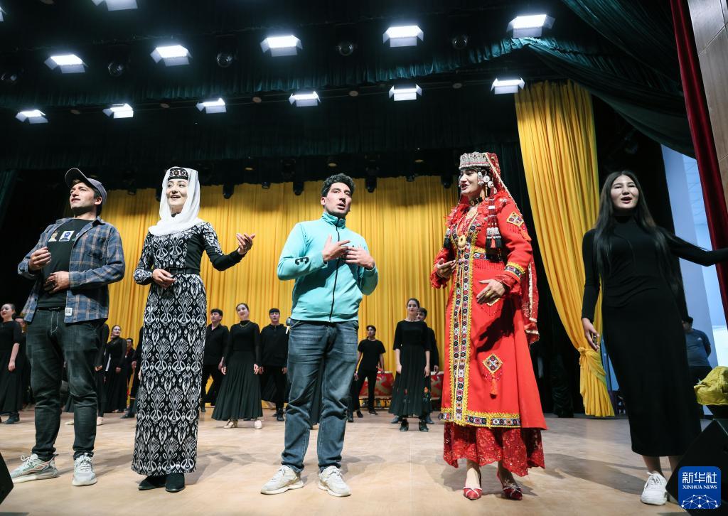 新疆塔縣歌唱演員在排練“帕米爾之聲·2023第二屆國際民族音樂節”晚會節目《我和我的祖國》(9月4日攝)。新華社記者 蘭紅光 攝