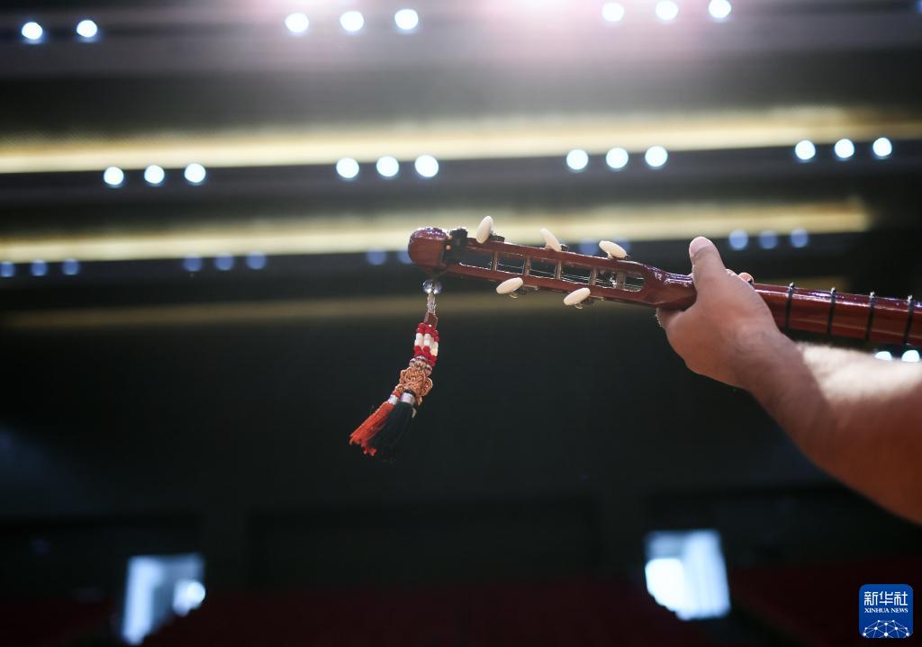 一名新疆塔縣文工團樂手在排練時彈奏熱瓦普(9月4日攝)。新華社記者 蘭紅光 攝