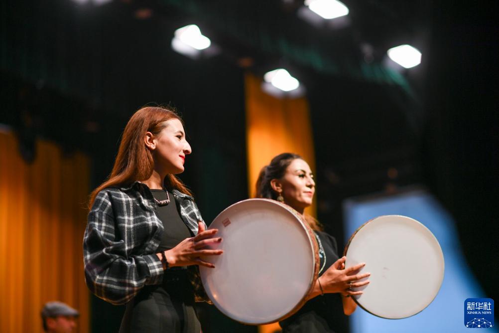 新疆塔縣文工團樂手美麗卡·依沙克(左)和同伴在排練時打手鼓(9月4日攝)。新華社記者 胡虎虎 攝