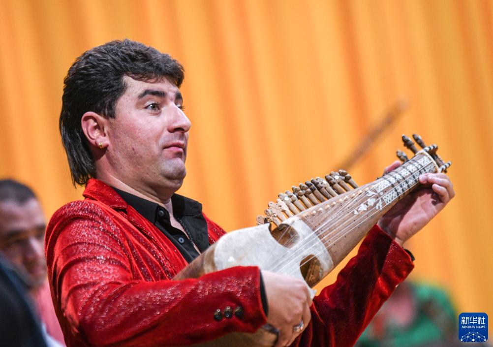 新疆塔縣文工團樂手吾拉木艾力沙·艾米茹米亞在排練節目《絲路遺夢》時演奏高音熱瓦普(9月4日攝)。新華社記者 王菲 攝
