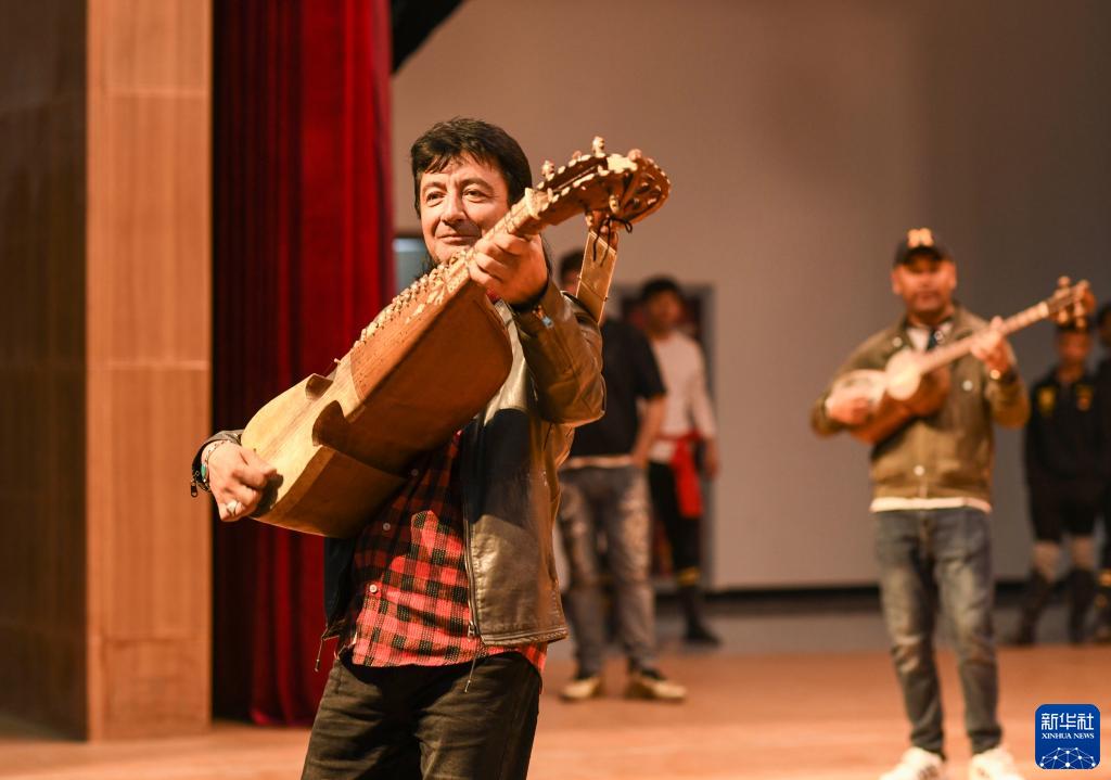 塔縣文化館館長艾孜木·胡西迪力(前)和樂手們排練(9月7日攝)。新華社記者 胡虎虎 攝