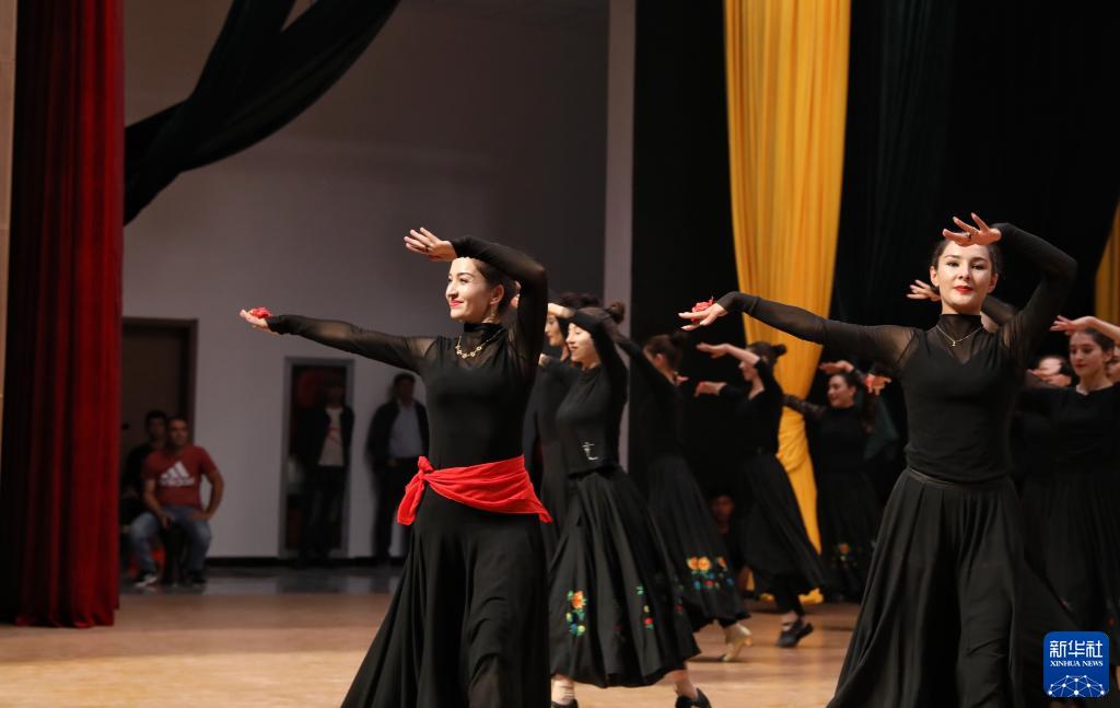 新疆塔縣文工團舞蹈演員古麗巴努爾·庫爾恰克(前左)和同伴們在排練節目《花兒為什麼這樣紅》(9月4日攝)。新華社記者 程婷婷 攝