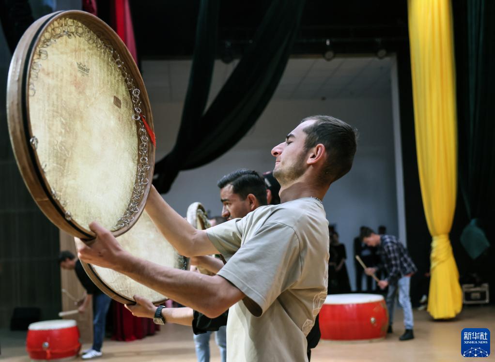 新疆塔縣文工團樂手居馬巴依·先比(右)在排練時演奏中號手鼓(9月4日攝)。新華社記者 蘭紅光 攝